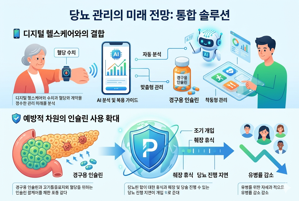 미래의 당뇨 관리는 경구용 인슐린 단독이 아닌 디지털 솔루션과 결합될 것입니다. 스마트 워치가 혈당 수치를 체크하고, AI가 적정 알약 복용 시점을 알려주는 식입니다. 인공지능 알고리즘은 환자의 활동량과 식사량을 분석해 상황에 맞는 적정 복용량을 가이드 해줄 수도 있습니다. 이러한 데이터 기반의 통합 관리는 당뇨병을 질병이 아닌 통제 가능한 일상으로 바꾸어 줄 것입니다. 기술과 약학의 시너지가 환자들에게 주는 가치는 무궁무진합니다.