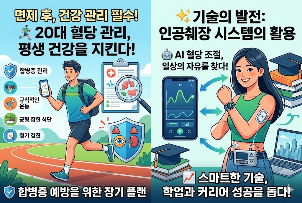 군 면제 판정을 받았다고 해서 관리가 끝나는 것이 아닙니다. 20대 청년기는 혈당 관리가 가장 소홀해지기 쉬운 시기인데, 이때 혈당 조절에 실패하면 30~40대에 망막병증, 신부전증 등 심각한 합병증이 발생할 수 있습니다. 규칙적인 유산소 운동과 균형 잡힌 식단 관리는 필수이며, 3개월마다 당화혈색소 검사를 통해 자신의 상태를 객관적으로 파악해야 합니다. 면제로 얻은 시간을 자신의 건강을 담보로 하는 것이 아니라, 더 건강한 미래를 설계하는 기회로 삼아야 합니다.