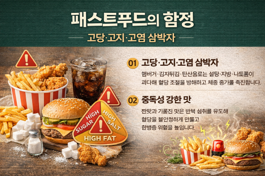 - 햄버거, 감자튀김, 탄산음료 등은 설탕·지방·나트륨이 모두 과다하게 들어 있습니다.